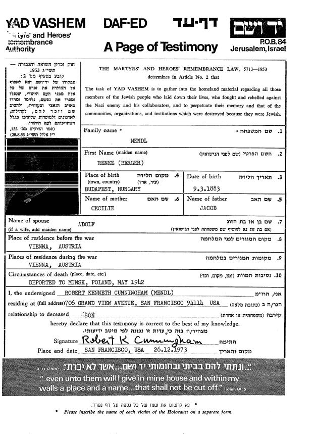 Rene married Adolf Mendl. They had one son, Kurt, born in 1919. Prior to WWII, the family lived in Vienna, Austria. On or about May 20, 1942, Rene was transported on Transport 22 Train Da 203 from Vienna to Minsk, Belorussia (USSR). Her prisoner number was 164.