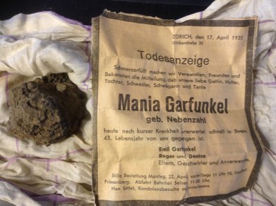 Inside the second kerchief was …..more ashes! However, this time, they were not just loose ashes. The lump was fairly well formed with only a few loose pieces. And…..there was a death notice identifying the “occupant.”