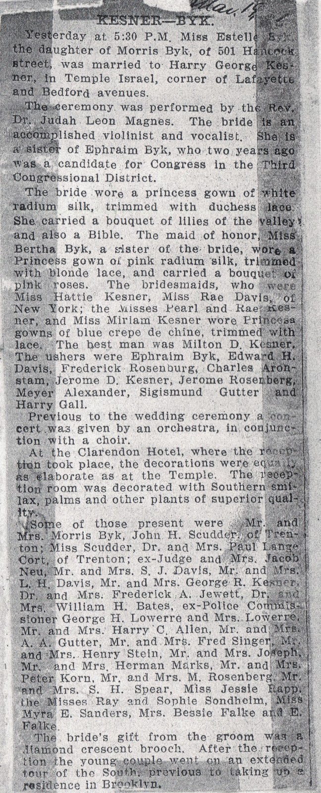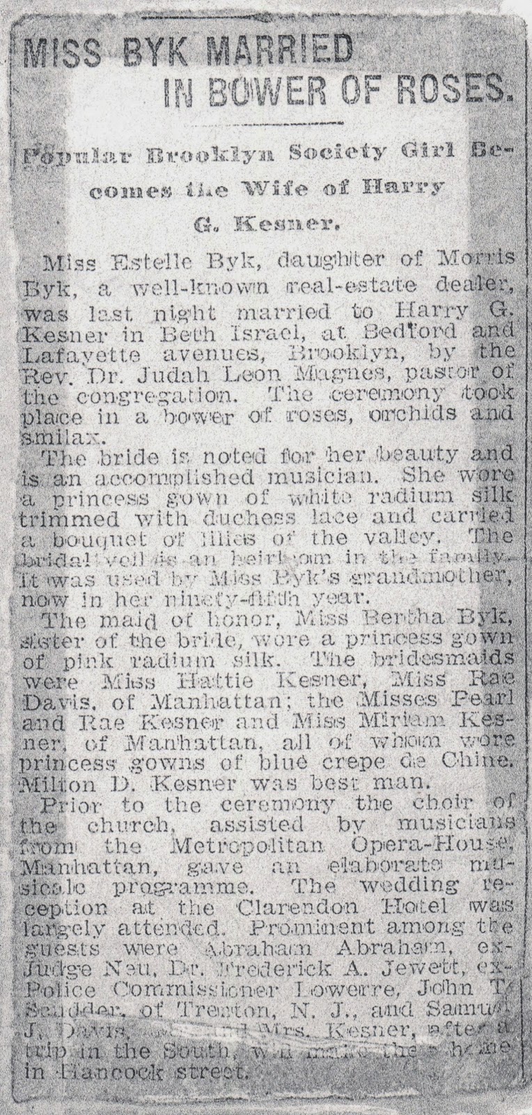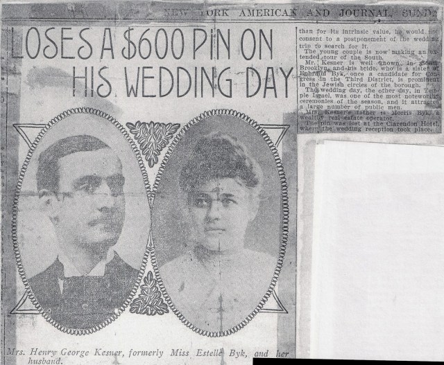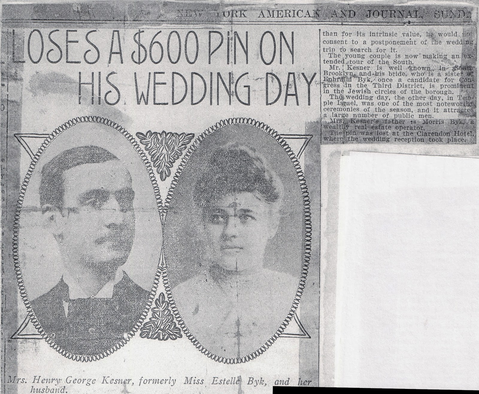 On November 5, 1905, Estelle announced her engagement to Harry G. Kesner. The couple married on March 18, 1906 at Temple Israel in Brooklyn. The wedding was a major social event and gained some notoriety when Harry lost the pin given to him by Estelle on their wedding day. In her scrapbook Estelle had pasted a clipping from the newspaper. Unfortunately, she didn’t