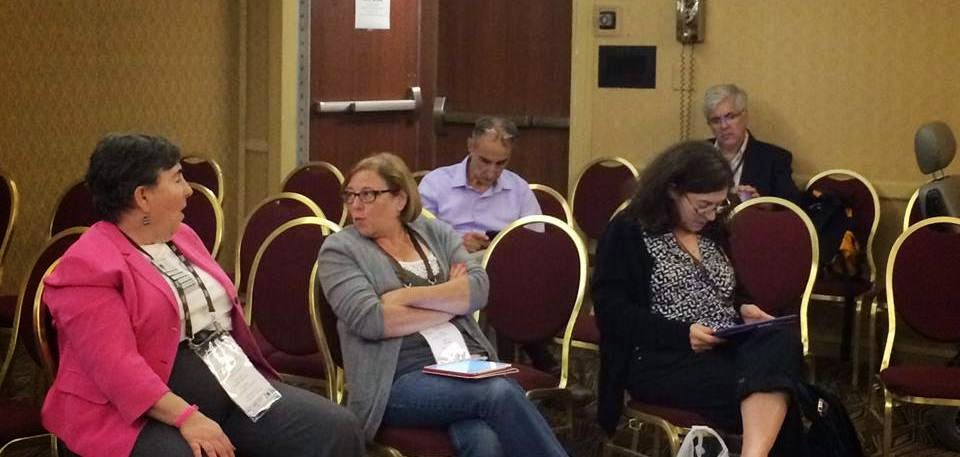| Me (in gray sweater) chatting with Jane Neff Rollins of Kitchen Sink Genealogy. Thanks to Rose Feldman (IGRA) for pic! |