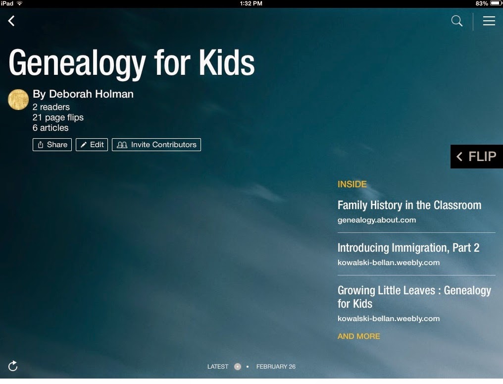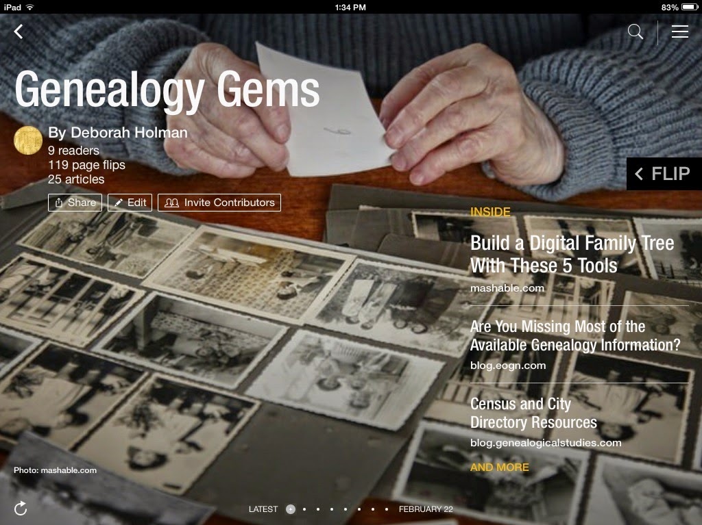 It does seem like a fun way to share family history with others. The look and feel is just like a print magazine including the ability to “turn” or “flip” pages (hence the name.) However, the drawback is that people have to know where to find you, be willing to install the app and remember to subscribe or follow in order to keep up with your new “issue.”