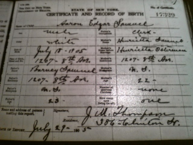 | 1905 Birth Certificate. This is the only reference I have found showing my grandfather’s name as Aaron Edgar Samuel. |