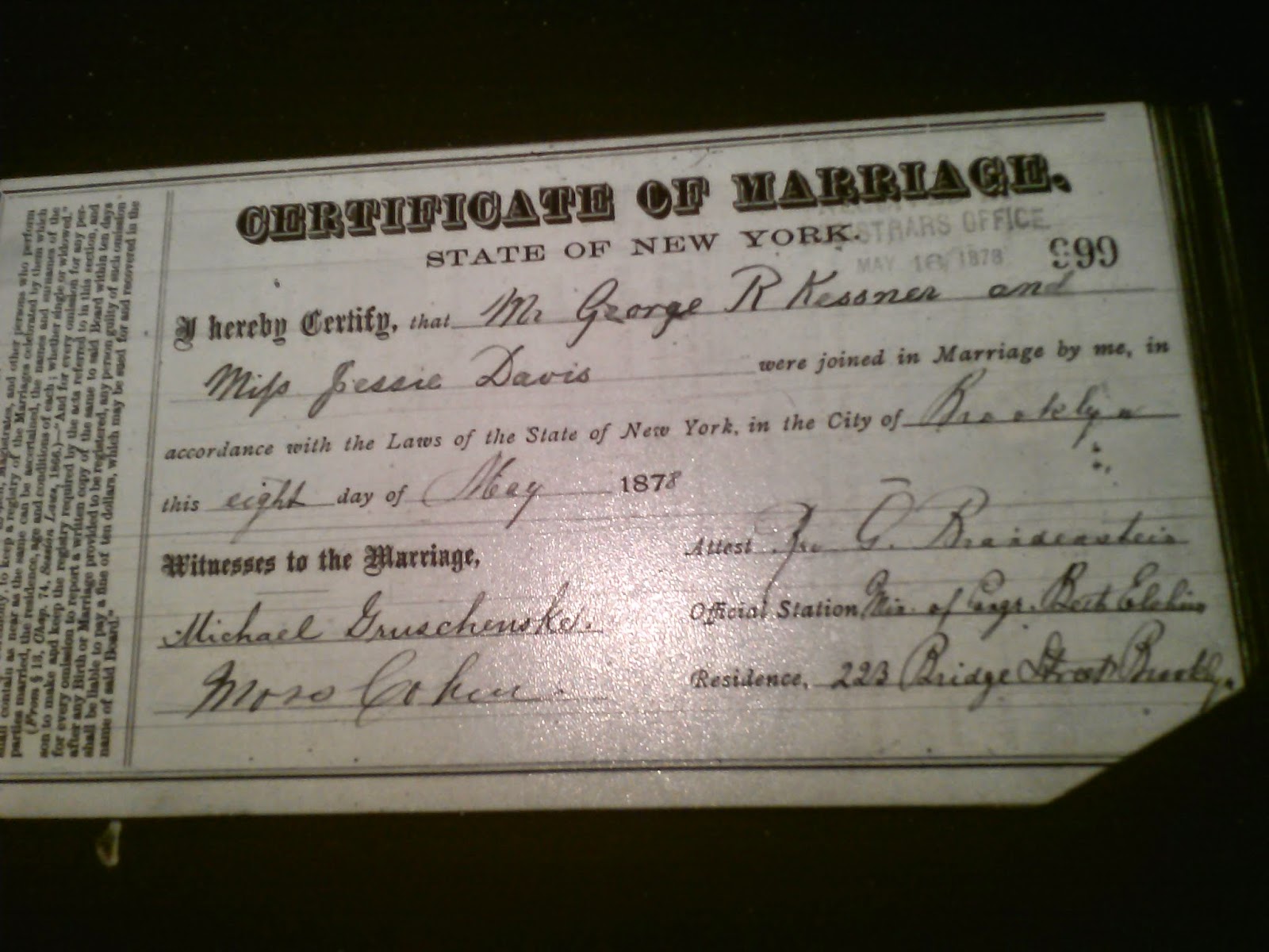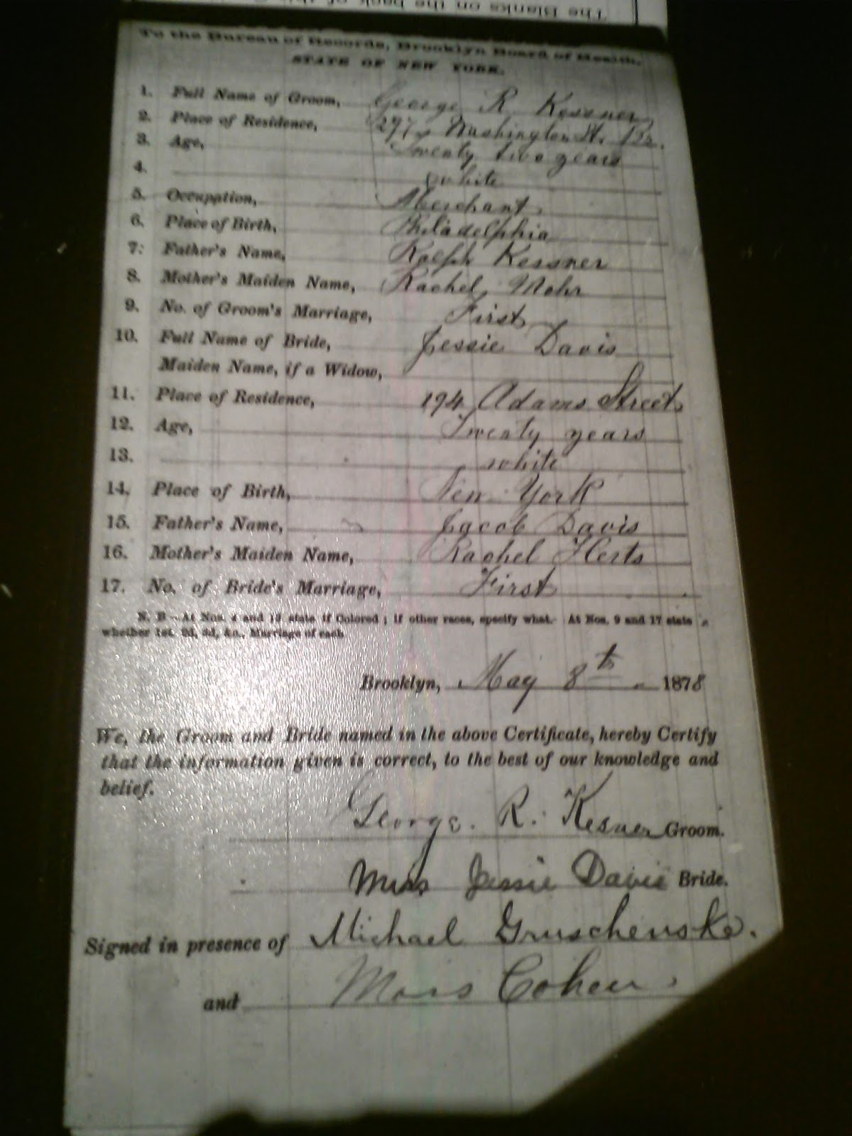 To the left is the 1878 marriage certificate of Hortense’s paternal grandparents, my paternal second great grandparents. I was pleased to find this as I have conflicting information about G.R. Kesner’s birthplace. I also had incorrect information about his mother’s last name.