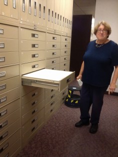 There was no need for concern. It was pretty easy to locate the films I needed. You copy down the film number from the record found online. Then go to the correct section where that film would be found. All the films are in drawers labeled numerically. The most difficult part for me was accessing the films in the uppermost drawers. Luckily they have those rolling stools everywhere – see picture!