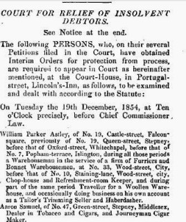 I wanted to determine why Aaron would make such a dangerous voyage with his large (and young) family. Considering he had petitioned for protection from debtors, I thought perhaps that would be a reason to leave. The debtor notice appeared in the Dec.5, 1854 issue of the London Gazette. Aaron was due in court on Dec. 19, 1854. I have been unable to find information regarding the disposition of his case.