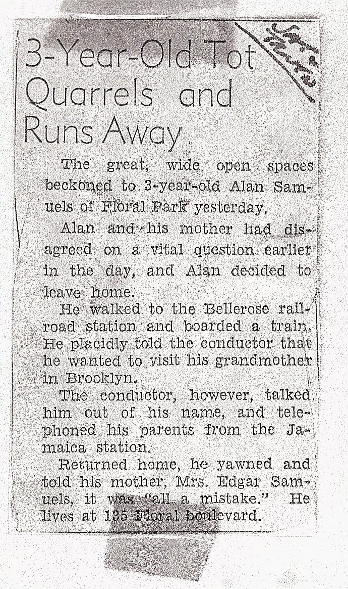 The little newspaper article in the family scrapbook shows that the story of me running away when I was three years old is true. I had an argument with my mother, and I stomped out of the house with the announcement “I’m going to see Nanny.” The notion of the toddler resentfully seeking support from his grandmother is unusual only that in going to see Nanny, I would have to travel from Jamaica, New York, to Brooklyn, a journey of about an hour on the Long Island Railroad.