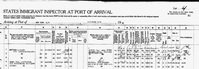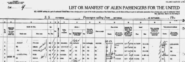 The second part of the manifest gives details of the passengers’ travel plans. Doris and her mother’s home address in Vienna is listed : XIX Silbergasse 43. Their final destination is listed as New York. Their passage was paid by Doris’ father. They had more than $50 with them. Next to Rosa’s entry it states she has never been in the US before. I know that to be false. I don’t know the reason for the error. Rosa’s brother Emile Speeger is listed as the person they intend to join in the United States. Emile changed his name from Spiegel many years earlier as he wanted to seem to “more American”! Both are listed as intending to become citizens of the United States. Rosa is described as being 5 feet 4 inches tall, with a fair complexion, brown hair and blue eyes. Doris is 4 feet 7 inches tall also with a fair complexion, brown hair and blue eyes. (I remember her eyes as being hazel!!) They were both in good health.