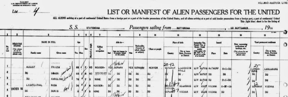 The first part of the manifest lists Doris and her mother, Rosa. Doris’ entry is stamped UNDER 16. Rosa is listed as 34 years old and a housewife. Doris is 6. Rosa’s place of birth is listed as Semarang in the Dutch East Indies. Doris’ place of birth is fairly interesting. It lists Vienna, in the country of GERMANY, not Austria, as one would expect. The reason for that is Austria had just been annexed to Germany by Hitler.