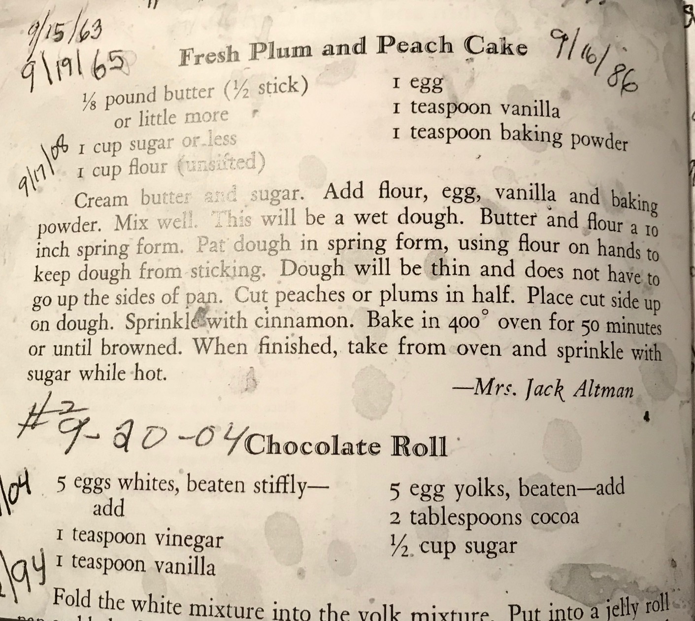 Almost every year from 1963 through 2011, my mother made our fall favorite: Peach and Plum cakes. There were two versions – one rectangular, with a thin crust. The other, made in a springform pan with a thicker crust. I’m a thicker crust kind of girl.