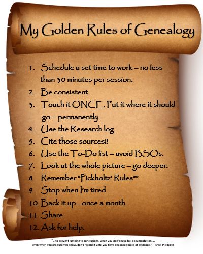 One of the first assignments was to create our own “Golden Rules of Genealogy.” Here’s my list: