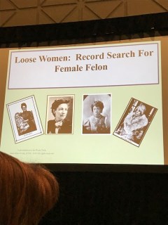 The next presentation was about Female Felons. Pretty dicy stuff! I figured I might learn some strategies for obtaining a mugshot of Catherine Seeley FitzAllen. At least one exists (circa 1895 Chicago) but I have had no luck despite MANY attempts to locate it. Turns out – the presenters of this talk are from…..wait for it…..CHICAGO!!! Not only that, but Janis Forte researches the same era – Nineteenth-century female criminals!! A new contact to help me – Yay!!
