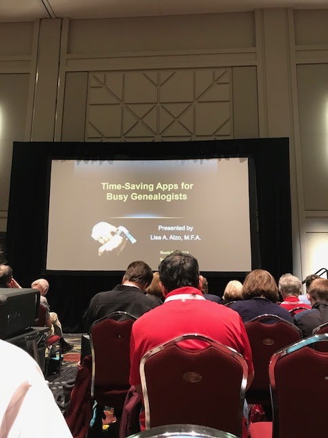 I attended two presentations today. The first was Lisa Alzo’s informative talk on apps for busy genealogists. I knew about quite a few of them, but it was interesting to hear her positive comments about the JoyFlips app I just downloaded yesterday. The REAL reason I went to her talk was to meet her in person and thank her for all that I have learned from her. I took both of Lisa’s Write Stuff Genealogy Intensive online courses. I wouldn’t have made the progress on my book without her guidance. Invaluable. Seriously.