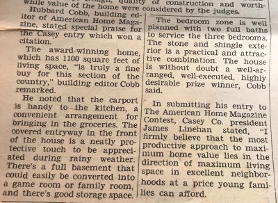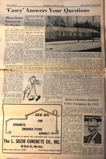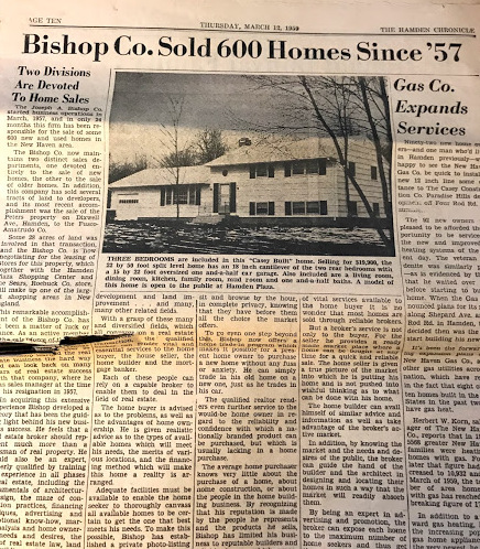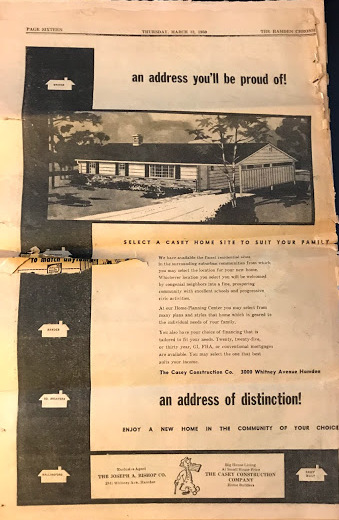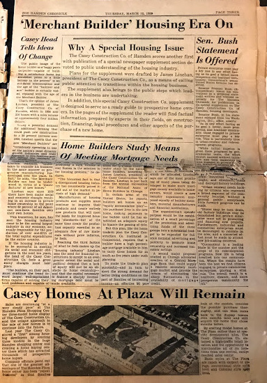 Note: My mother saved the March 1959 supplement to the local paper, the Hamden Chronicle which detailed the construction of the Casey homes. Here are a few relevant screenshots: