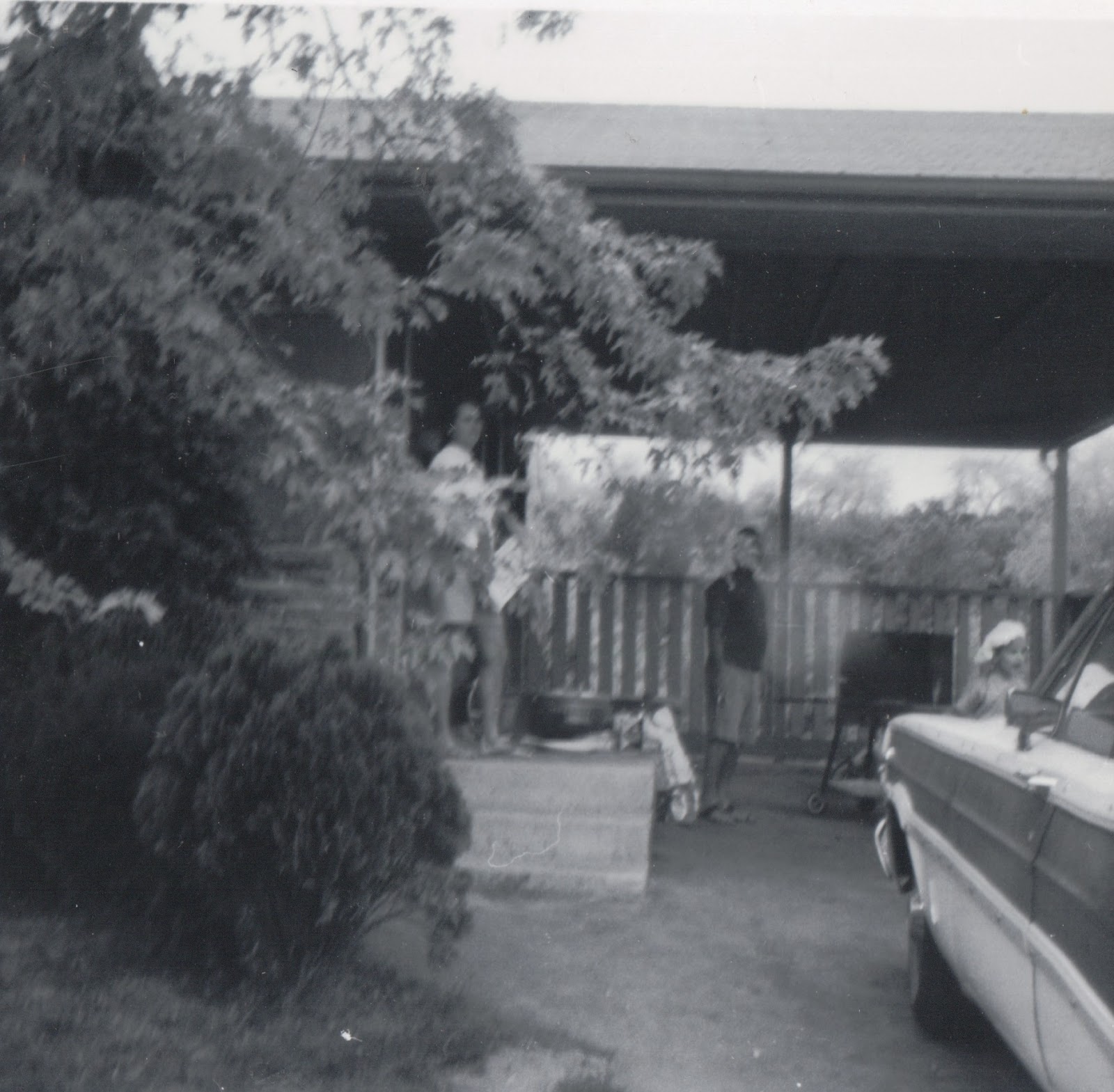 | Grilling in the carport – circa 1968 or 1969? Watching from the steps is my mom. Manning the grill is my stepdad, Al Falcone. The “little chef” in front of the station wagon in my brother Dean. |