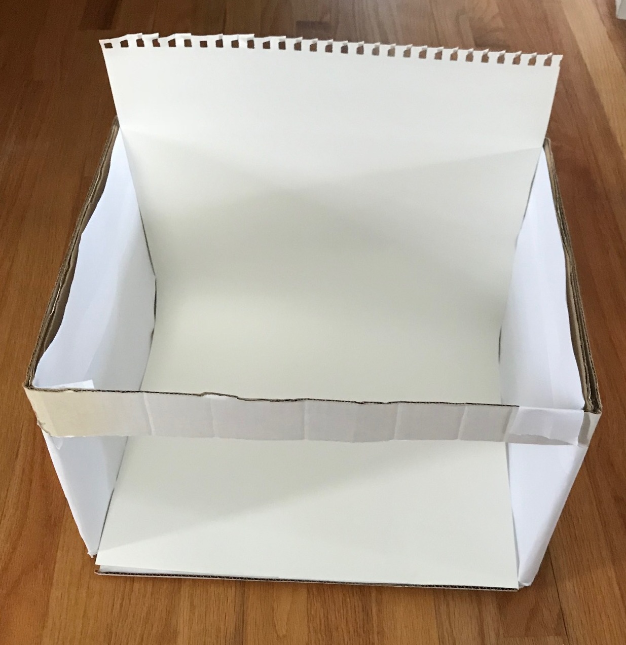 Line the box with white paper, making a curve with paper in the back so it won’t show up in your background. I happened to have legal size printer paper, but any white paper will do.