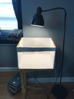 Arrange your lighting. The original post suggested two lamps, using 100-watt daylight bulbs. I’m sure that would give excellent results. But, I didn’t have two adjustable lamps and I didn’t want to buy bulbs. So, I moved my Ikea lamp, with a soft-white 60-watt bulb over the box. I think I got satisfactory results!