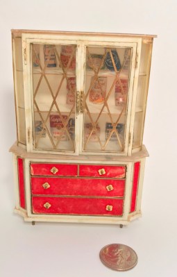 The cabinet to the left is one of the few original pieces I have left from the Petite Princess line of Ideal dollhouse furniture made in 1965. Waaaaaay before the days of “printables” (things you print in mini size using a computer), I cut out “food” from coupons and pasted them in. This was one of the first “real” pieces of dollhouse furniture that my Mom bought for me.