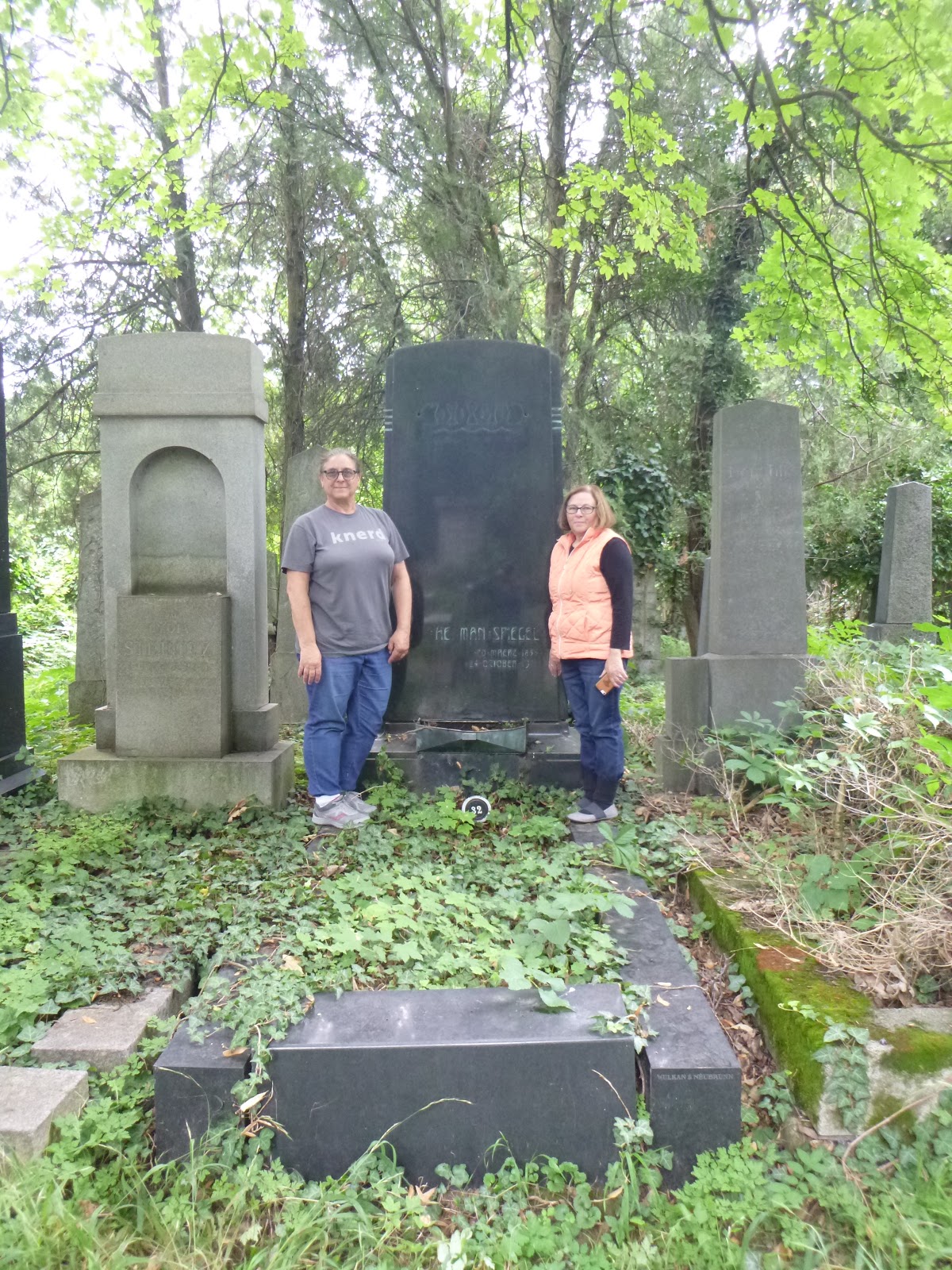 | My sister Jeanne and me at the gravesite of our great-grandfather Herman Spiegel. Photo by Barbara Kintaert. |