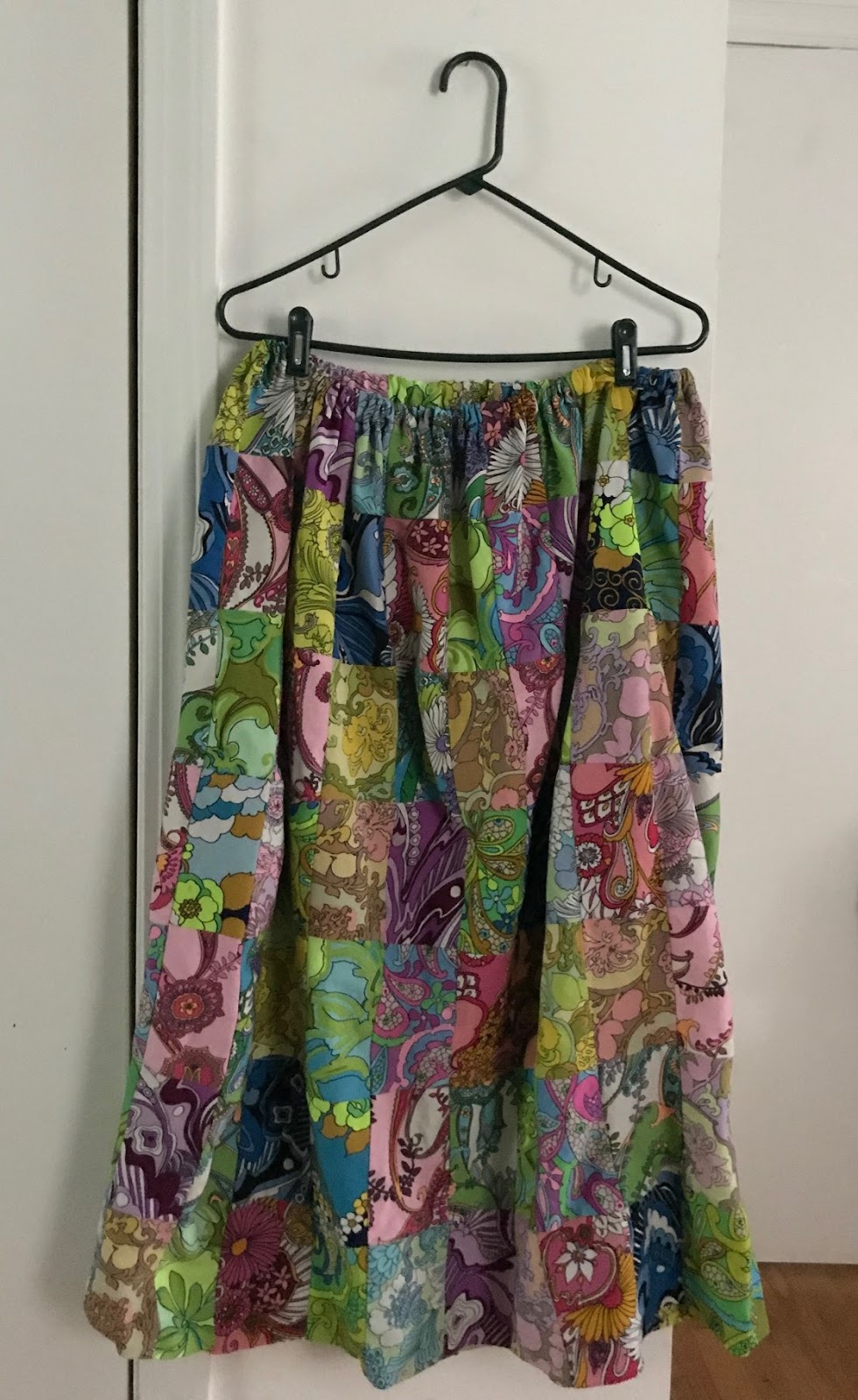 If that’s not “colorful” enough for you, I saved the best for last. This item was a mainstay in my wardrobe – especially while I was recuperating from mononucleosis in March 1974. I created the patchwork skirt from dozens of psychedelic polyester fabric pieces torn from sample books given to me by Mr. Moskowitz. I still have the skirt, affectionately named by my sibling as “The Mono Skirt.”