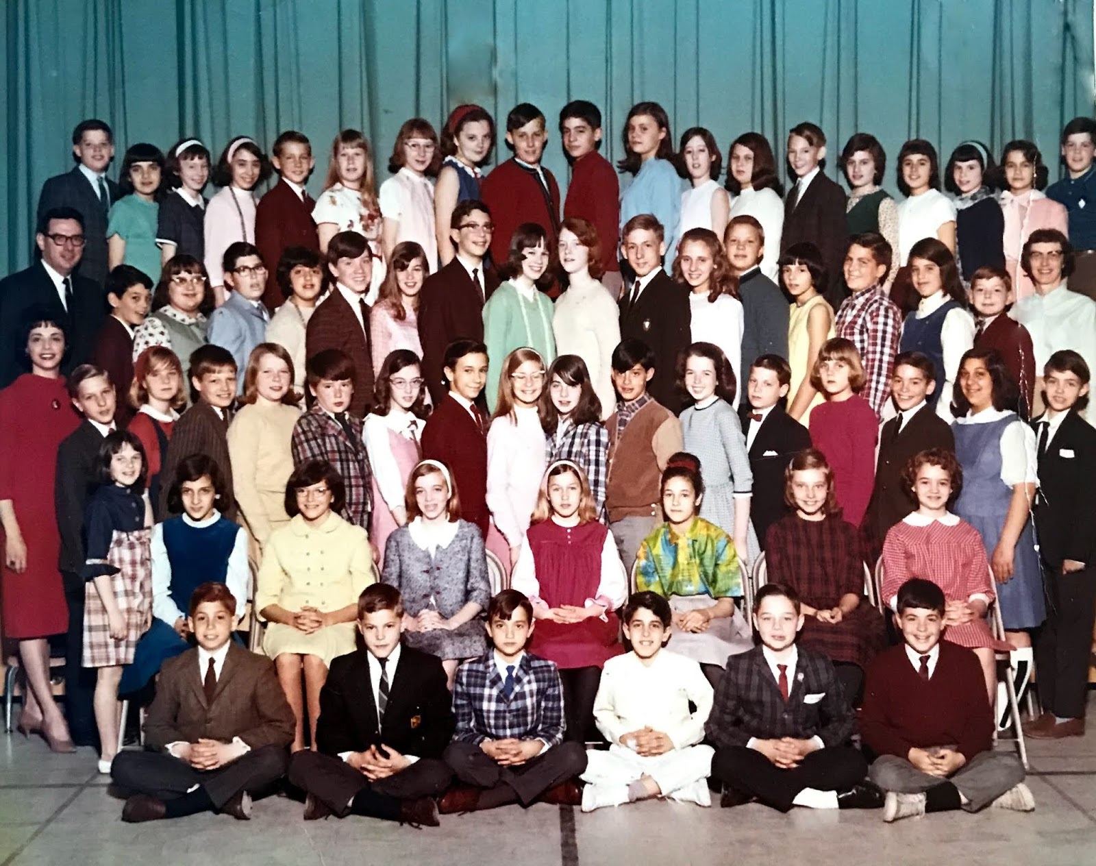 1966 Bear Path School 6th grade class. Can you find me? I’m the short girl on the left, not much taller than my friend, Nancy who is sitting down, and a full head-and-neck shorter than Jon standing behind me! Mrs. Jomini is wearing a red dress and standing behind Jon. |