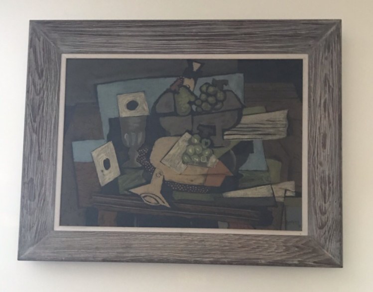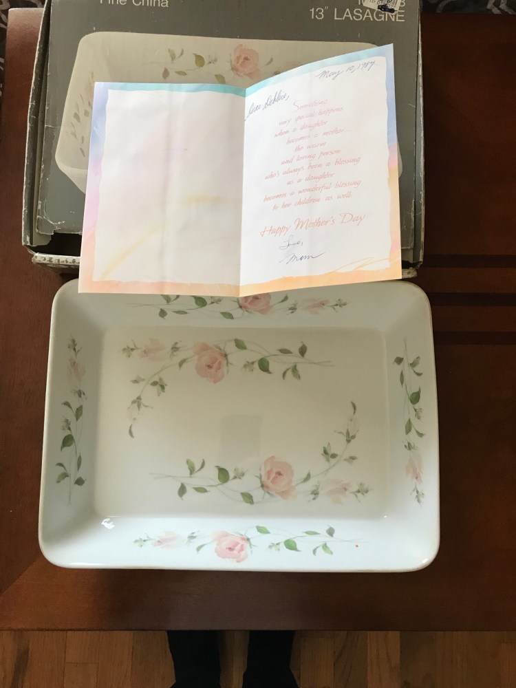 9. “Is that the Braque?” Why, yes. Yes, it is. This print by Georges Braque hung at the bottom of our basement stairs for years. It’s a small bone of contention between my sister, Jeanne and myself. Don’t worry, Jeanne. If you still want it when I’m tired of looking at it, I’ve got your name on it!!10. The Toy Pile – Ready for little ones to come visit!11. Technically this isn’t in my view. It’s actually in the cabinet. But I know it’s there!! My Mom gave me this lasagne dish for Mother’s Day in 1987. It has no monetary value but means the world to me!!12. The bane of Scott’s existence! My couch, laptop, and the glass table Meghan gave me. If you think I’ve been productive up to now, just wait!!! More projects on the horizon!!
