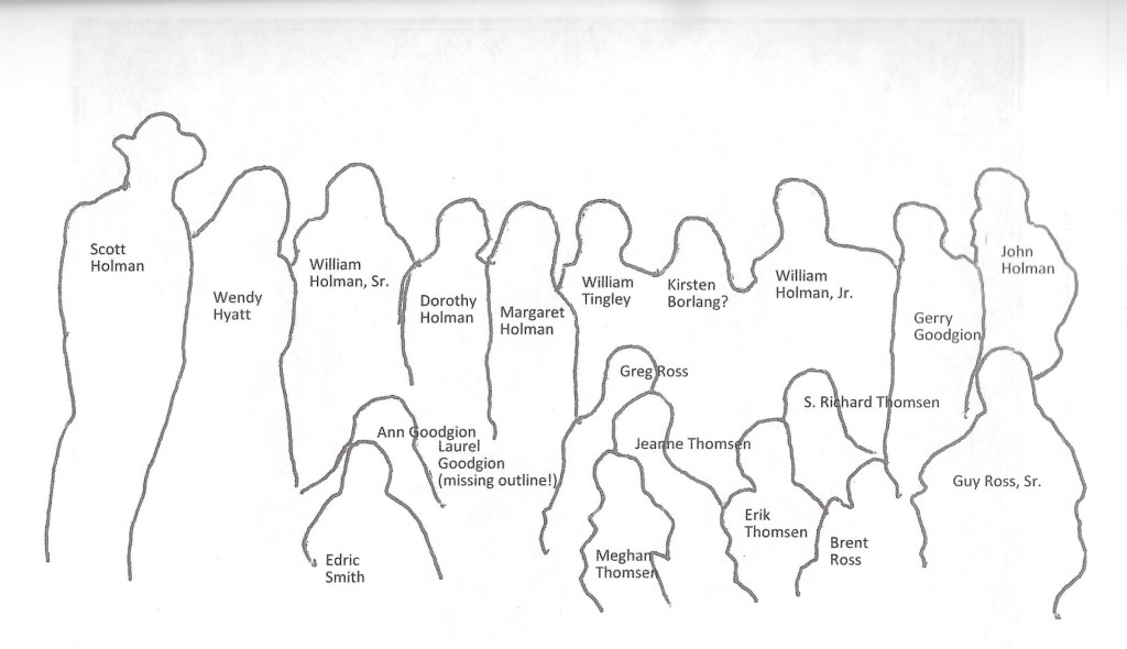 For this “lower-tech” solution, I outlined the original photo (see original below), scanned it and added names in mostly the right places. I think it’s easier to see names using this method. Printing the photo in black-and-white before outlining makes it a little easier as well.