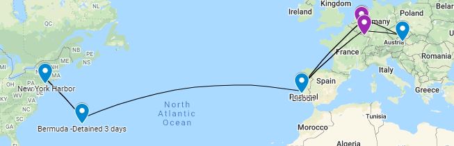 The map below shows the actual emigration route. Sigmund and Rosa started their journey on Feb. 26, 1941. After traveling on land (most likely by train) they arrived at Lisbon, Portugal where they boarded the ship the Serpa Pinto for the voyage to America.