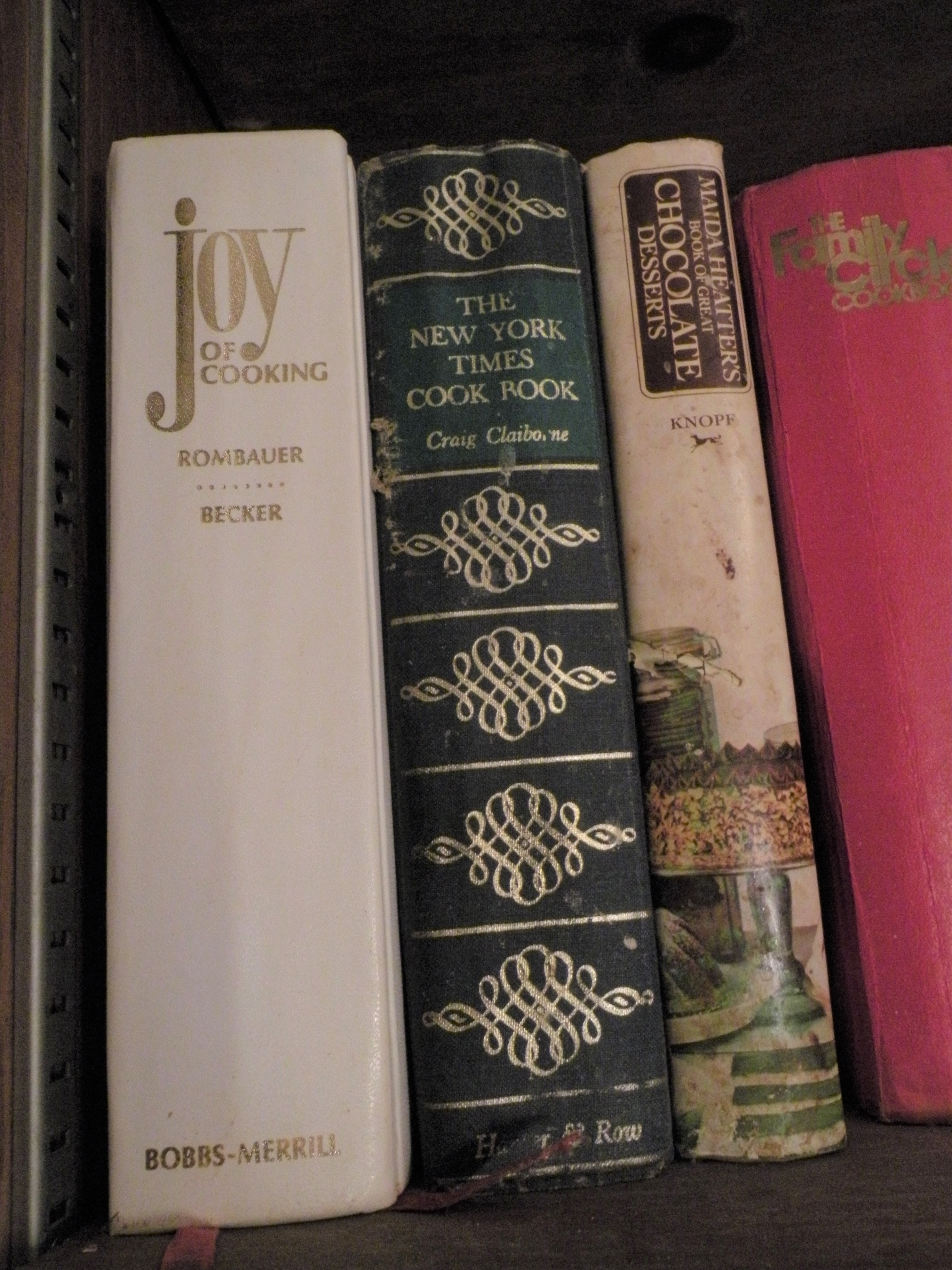 The books Mom used most often had a prominent place on a black shelf in the kitchen. A nightstand in its former life, my mother painted it in her “signature” gloss black. This was a hold-over from her “Chinese Black and Red” period when she painted everything in the kitchen using that color scheme!