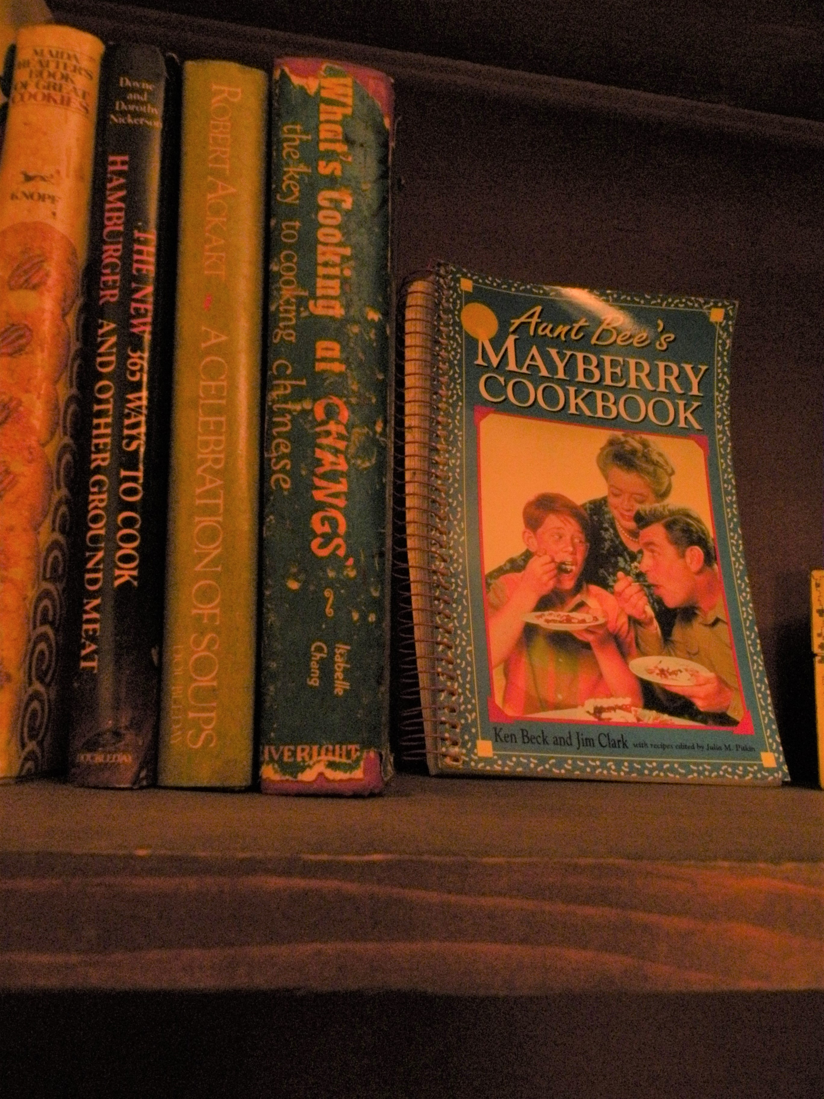 When I say the shelf had a prominent place I wasn’t kidding. It sat against the short length of wall to the right of the basement door. Our kitchen was not large. Due to the placement of the cookbook shelf, it was nearly impossible to pass through when all the seats at the table were taken!