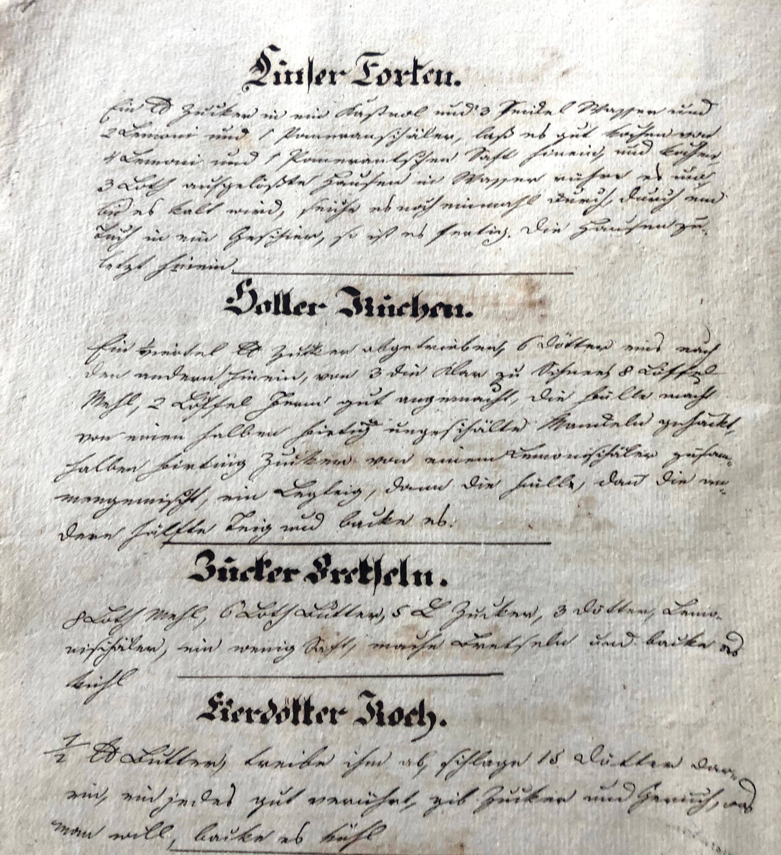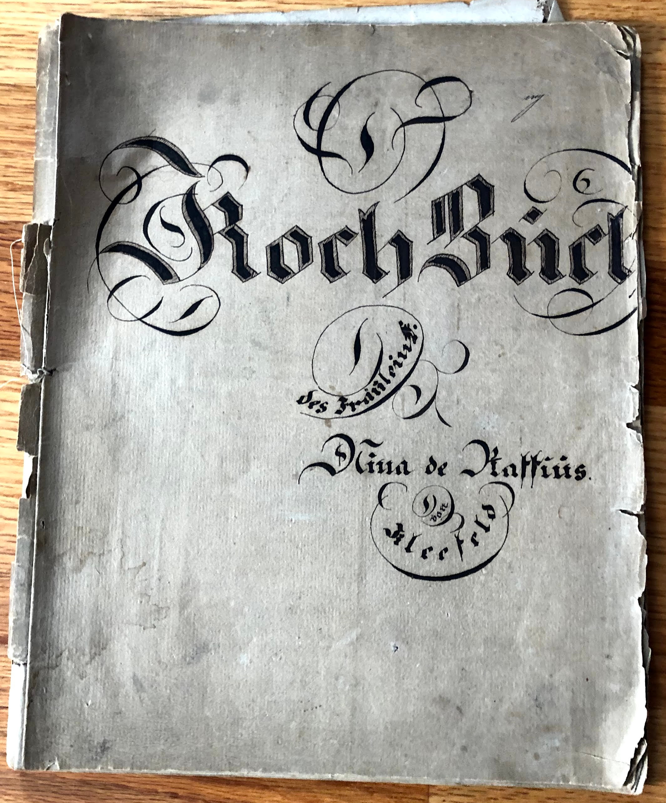 I do have one surprise addition to our cookbook collection. Among my grandmother’s things there was an old cookbook. Really old. Like maybe from the 1840s old. I have no idea of the origin. I’m guessing it might have belonged to my great-grandmother, Sophie Weiss Spiegel. I’ve put requests out on a Facebook group, Genealogical Translations for help in translating, to at least try and determine the author. I’m also waitintg on some assistance from Katherine Schober, of SK Translations. (I’m taking her online course “Reading the Old German Handwriting.” It’s really hard!!)