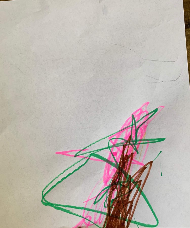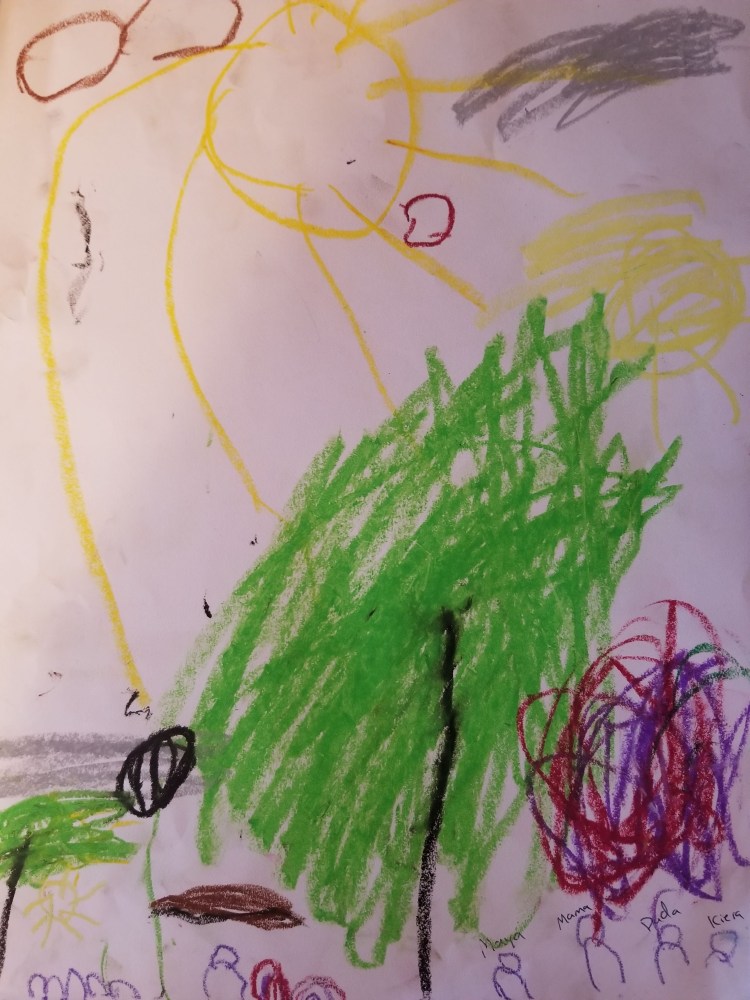 Maya portrayed her world exactly how a pre-schooler would – we are tiny people in a BIG WORLD. But the tree is strong and the sun is shining. We will be fime.
