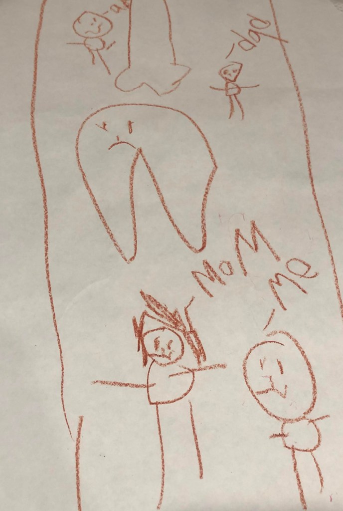 Mom and Jack figure prominently and are quite close to each other. What appears to be a huge, and very sad tooth, floats in the center just to the left of Dad. (He has lost quite a few teeth, so there’s that.) Little brother, Abe? Oh! There he is! Waaaaay at the top of the drawing. To the left of… um… the left..of.. is that a..?