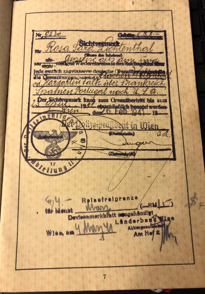 On February 18, 1941, Rosa’s passport was stamped in Vienna in preparation for the trip to the United States. She and Sigmund were scheduled to travel from Vienna to what is now Taurage, Lithuania. From there they would travel to Malkinia Gorna, Poland before heading to Moscow. From Russia they would make their way to Japan, then finally to the United States. Presumably the 65-year-old couple, already in failing health, would then make their way 3,000 miles across the United States before being reunited with their family in New York. This trip, about 13,475 miles, would have been a little more than half of the 24,901 miles it would take to circumvent the Earth! Thankfully, the Lichtenthals never had to experience that harrowing itinerary.