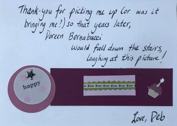 This picture has become a CLASSIC. When I was in 2nd grade (1961-62) we were scheduled to visit the Admiral Jack show. First: I forgot we supposed to go and went to my Brownie meeting instead of going home on the bus. Boy, was Mom mad that she had to drive to school and get me before driving us to downtown New Haven for the show. Second: I got to sing “Open Up Your Heart (And Let the Sun Shine In)” on air!!! It was featured on the Flintstones TV show, sung by Pebbles. No idea why Admiral Jack chose that particular song, but I’m pretty sure I nailed it. Third (and this is the best part): Mom hung this photo on the wall of the stairwell leading down to the basement. One day my best friend Doreen came over. We were heading down the stairs when Doreen lost her footing and almost fell down the flight of 13 steps. She had gotten a good look at the expression on my face and just lost it, laughing. We now refer to this type of facial expression as an “Admiral Jack Smile.”