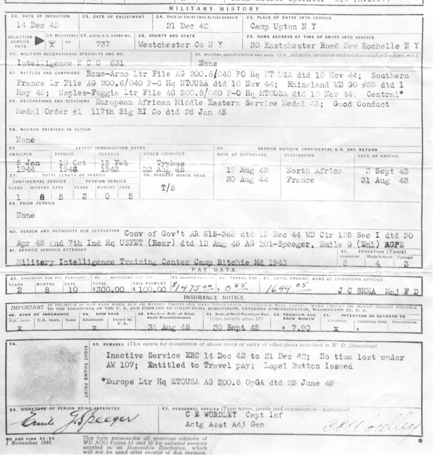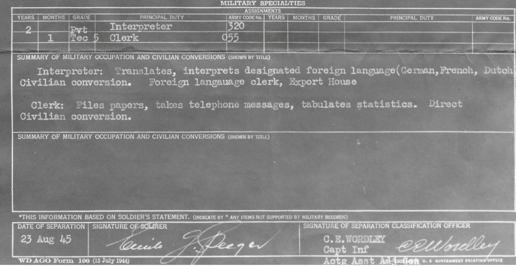 I knew that my uncle, Emile Speeger (He changed his last name from Spiegel on June 24, 1936) had served in the United States Army in some capacity. We have fascinating photos he brought back of the interior of Eva Braun’s home while working alongside the American Red Cross in Germany. I had a vague recollection that he had worked in intellegience.