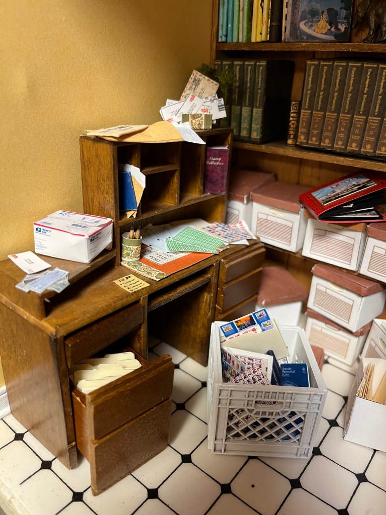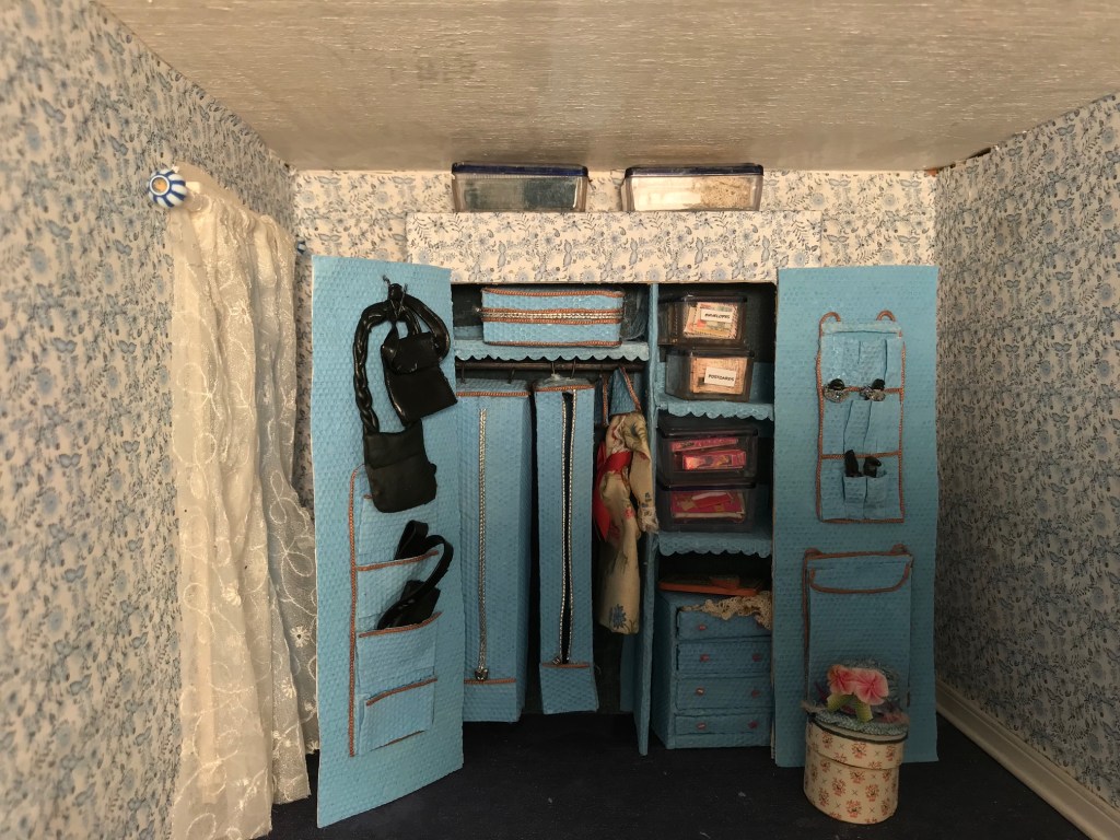 This project was born somewhat out of necessity. My mother, Doris Falcone, built the house for our two daughters. In June 1997 we brought the house to our home to finish working on it. Then we had a house fire. The house sat for years after the fire because I just couldn’t bear to work on the mangled structure. Eventually, I decided to pretend a hoarder lived in the slightly askew, definitely worn-looking structure. It was a perfect solution to explain away the warped walls, the peeling paint, and the wrinkled wallpaper. At some point, after my mother passed in December 2011, I decided to decorate it in her memory. You can read more about this project on my other blog, Dorette Creations.