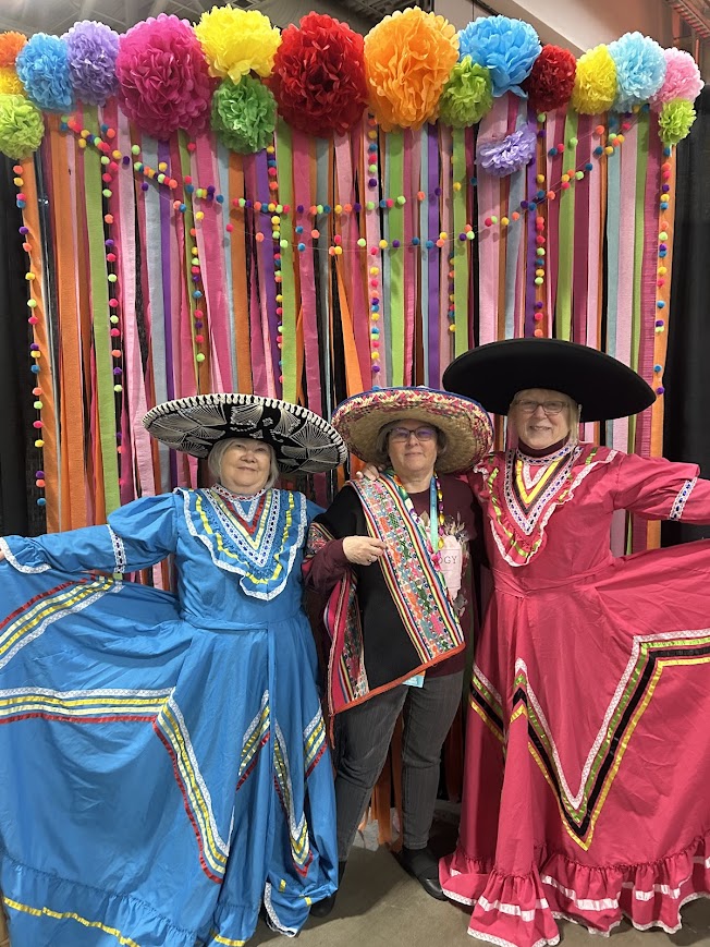 We decided to forego the keynote since yesterday’s was a little “eh.” It’s recorded anyway, so we can watch it later if we want. That gave us time to have a little fun dressing up! I was the Peruvian caballero sandwiched between two lovely ladies from Mexico.